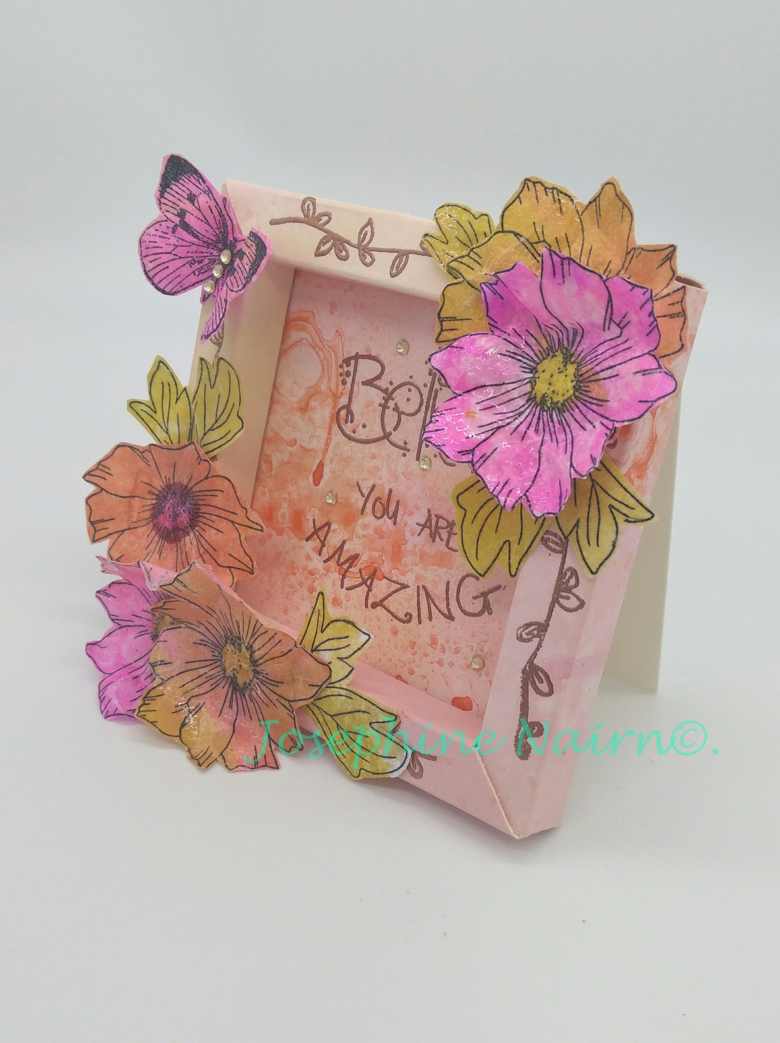 Josephine demonstrates for Trim Craft and uses a variety of styles for her cards, frame cards being a popular one at the moment for most crafters, and the one below is a mixture of flowers and butterflies adorning a white frame (be your own amazing)